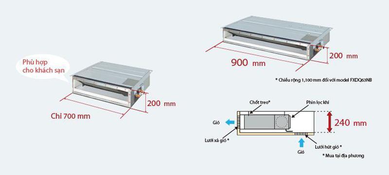 Kích thước lỗ trần (B – khoét trần): 430×230mm, 630×230mm, 830×230mm, 1030×230mm.