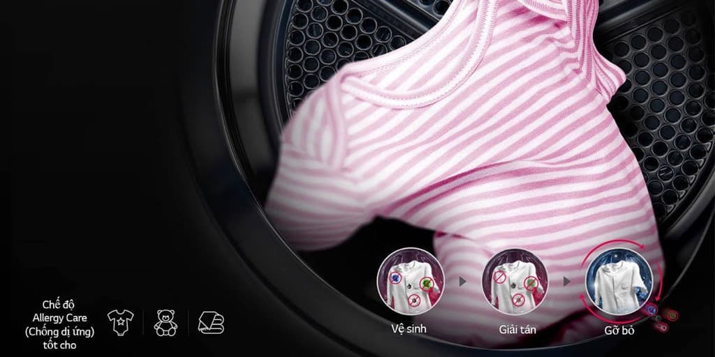 Đến 99.9% vi khuẩn, các mạt bụi bám trên quần áo sẽ được công nghệ Allergy Care loại bỏ hoàn toàn. Nhờ đó, máy không chỉ sấy khô mà còn giúp áo quần sạch khuẩn, ngừa dị ứng, an toàn cho làn da, thích hợp sử dụng khi nhà có các bé nhỏ và người lớn tuổi.